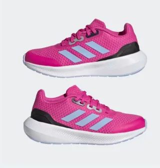 Zapatillas deportivas Adidas Runfalcon en talla 40. Combinan un diseño vibrante con detalles en azul claro y negro sobre una base rosa. - Parte superior de malla transpirable. - Tres rayas icónicas de Adidas en los laterales. - Suela blanca con buen agarre.