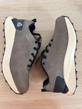 Zapatillas de estilo casual con un diseño moderno. - Combinación de colores beige y marrón. - Materiales de ante y tela. - Suela de goma. - Cierre con cordones.