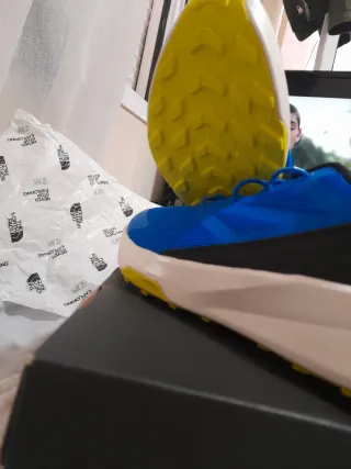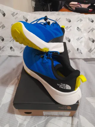 Zapatillas deportivas The North Face en talla 39. Combinan azul y amarillo con detalles negros. - Diseño moderno y deportivo. - Suela blanca con detalles amarillos en la punta y el talón. - Logo de The North Face en el lateral.
