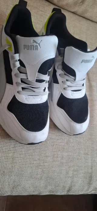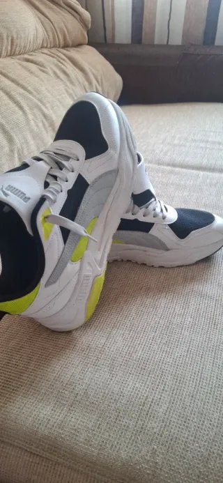 Zapatillas deportivas Puma con un diseño moderno y llamativo. - Combinación de colores blanco, negro, gris y detalles en amarillo neón. - Materiales de calidad para mayor comodidad. - Suela robusta para un buen agarre.