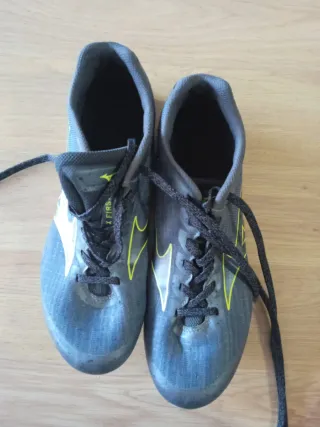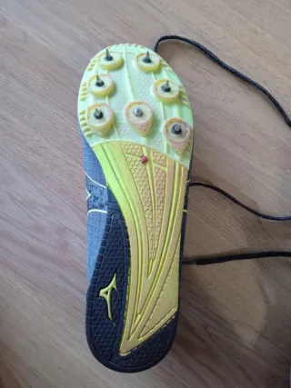 Zapatillas de atletismo Mizuno para niño. - Color gris con detalles en amarillo. - Cierre con cordones. - Clavos un poco desgastados pero se pueden cambiar. El resto está en buen estado.