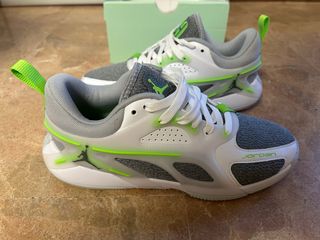 Zapatillas deportivas para baloncesto Jordan Heir talla 39 con un diseño moderno y llamativo. - Combinación de colores gris, verde y blanco. - Detalle de logo Jordan en el lateral. - Tirador en el talón para facilitar su puesta. Nuevas a estrenar. Precio original 110€. Se envían en su caja, aunque no dispongo de la tapa.