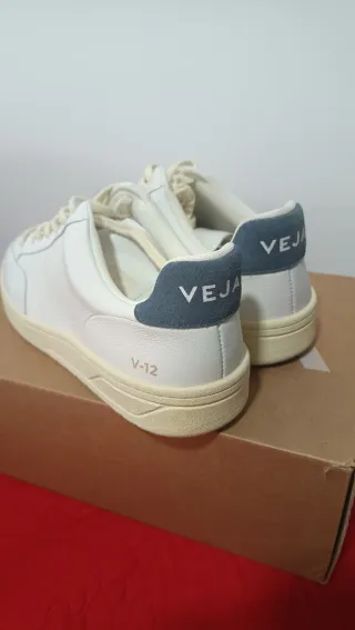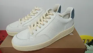 Zapatillas Veja V-12 de cuero blanco con detalles en azul. - Modelo V-12 Stitch O.T. Leather. - Combinación de blanco y azul. - Cierre con cordones.