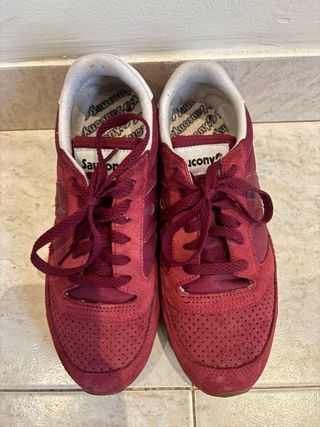 Zapatillas deportivas de la marca Saucony en talla 40. Un calzado cómodo y con estilo. - Diseño en tonos granates y rojos. - Materiales de ante y tela. - Cierre con cordones. - Puestas en muy Pocas ocasiones