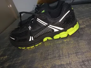Zapatillas deportivas Nike con un diseño moderno y llamativo. - Combinación de colores negro y verde neón. - Detalles reflectantes en los cordones y el talón.