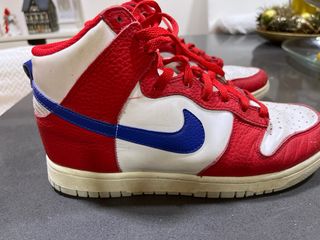 Zapatillas altas Nike Jordan en talla 41. Combinan cuero rojo y blanco con detalles azules. - Cierre con cordones rojos. - Diseño de caña alta. - Suela de goma blanca.