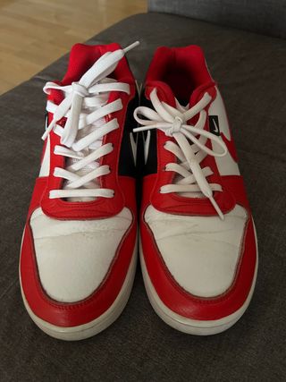 Zapatillas deportivas Nike con un diseño llamativo. - Combinación de colores rojo y blanco. - Cierre con cordones blancos.