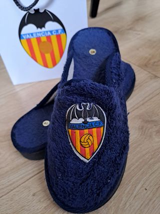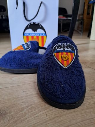 Comodísimas zapatillas de estar por casa del Valencia C.F. Nuevas a estrenar. - Color azul marino. - Diseño con el escudo del Valencia C.F. en la parte delantera. - Material suave y cálido.