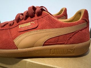 Zapatillas Puma Palermo en color rojo y marrón. - Exterior de ante. - Detalle de franja lateral. - Suela de goma.