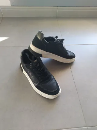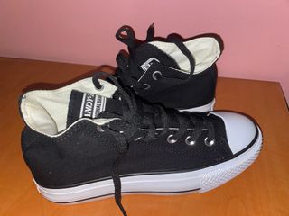 Zapatillas deportivas de caña alta con un diseño moderno. - Combinación de colores negro y blanco. - Detalle en color rojo en la parte trasera. - Cierre con cordones blancos. Solo tiene los cordones un poco manchados pero están perfectas