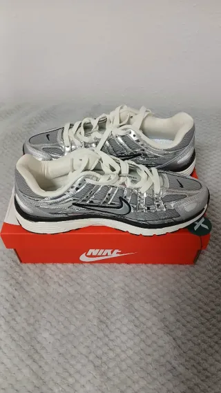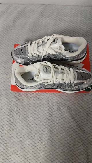 Zapatillas deportivas Nike con un diseño moderno y llamativo. -Nuevas a estrenar - Combinación de colores plateado y blanco. - Detalle de swoosh lateral. - Cordones blancos.
