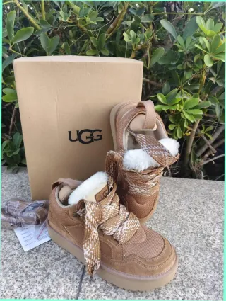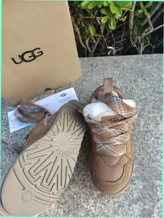 Zapatillas UGG Lowmel en color beige y marrón. Perfectas para un estilo casual y cómodo. - Diseño de caña baja. - Detalle de pelo en el interior. - Cordones anchos con estampado. - Suela gruesa y resistente.
