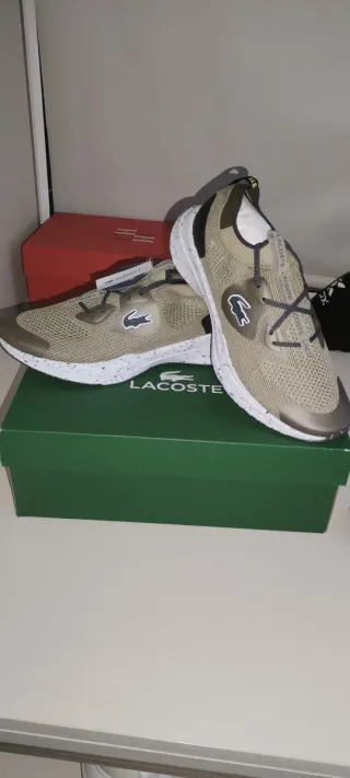 Zapatillas deportivas Lacoste en color beige y verde, talla 43. Perfectas para el día a día. - Diseño moderno y ligero. - Logo de Lacoste en el lateral. - Suela con detalles moteados.