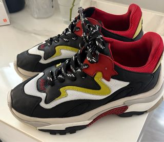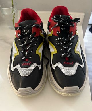 Zapatillas deportivas de la marca ASH con un diseño moderno y llamativo. - Combinación de colores negro, blanco, rojo y amarillo. - Cierre con cordones. - Detalle de logo en la lengüeta. Puestas en una ocasion ( me vienen grandes) Me costaron 219 €