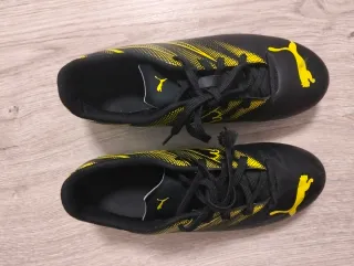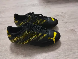 Zapatillas de fútbol Puma para niño, en talla 38.5. Diseñadas para el juego en césped. - Color negro con detalles en amarillo. - Cierre con cordones.