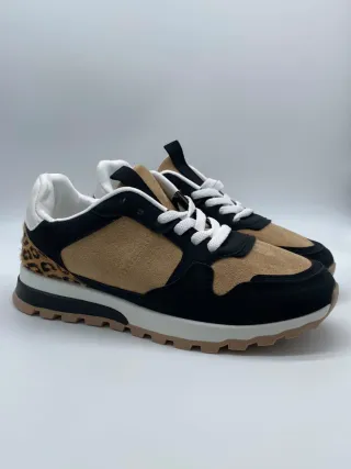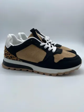 Zapatillas deportivas con un diseño moderno y llamativo. - Combinación de ante y detalles de pelo. - Estampado de leopardo en el talón. - Suela de goma resistente.Nuevas en su caja.