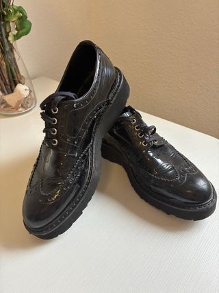 Zapatillas estilo Oxford con acabado charol. - Diseño con cordones. - Suela gruesa. - Detalle de picado decorativo.