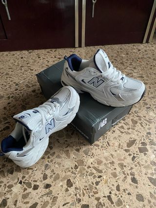 Zapatillas deportivas New Balance en tonos blanco y plateado. Perfectas para el día a día. Nuevas sin estrenar con caja. Talla 39 - Diseño moderno y cómodo. - Detalles en azul marino.