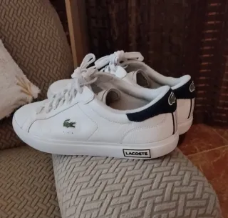 Zapatillas deportivas Lacoste modelo Powercourt. - Diseño clásico y versátil. - Detalle del logo del cocodrilo 🐊 - Banda con el nombre de la marca en la suela. - Le falta una L en una de las zapas y tiene un pequeño desgaste en las puntas. ( De fácil arreglo) . Por lo demás, están muy bien conservadas.
