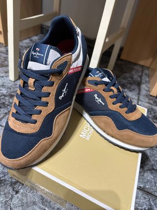Zapatillas de estilo casual para hombre de la marca Pepe Jeans London. - Combinación de colores azul y marrón. - Diseño deportivo y moderno.