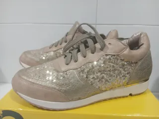 Zapatillas casuales con un diseño brillante y moderno. - Detalle de lentejuelas doradas y plateadas. - Combinación de texturas en el exterior. - Cierre con cordones.