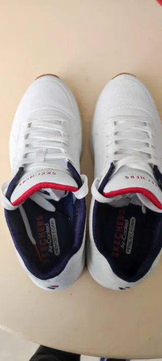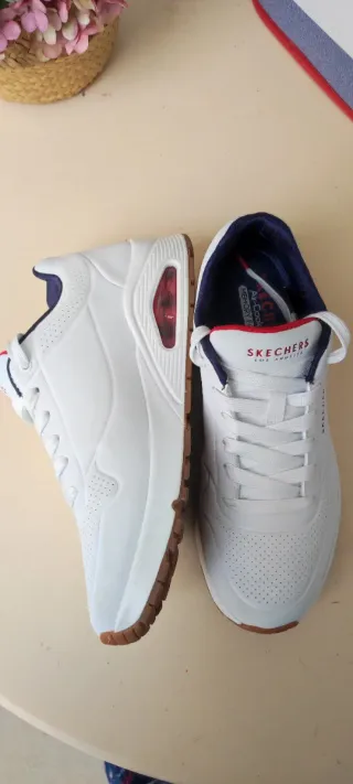 Zapatillas deportivas Skechers, talla 40, en color blanco, impecables, solo usadas una vez, las vendo porque me quedan muy justas. Interior con plantilla Air-Cooled Memory Foam.