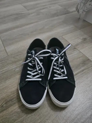 Zapatillas deportivas con un diseño moderno y llamativo. Usadas una sola vez porque me equivoqué al pedir la talla. - Combinación de colores blanco y negro. - Cordones a juego. - Suela de goma.