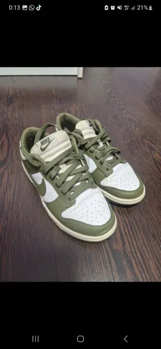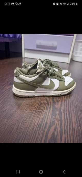 Zapatillas Nike Dunk en tonos verde oliva y blanco. Ideales para combinar y se encuentran en muy buen estado. - Parte superior de cuero. - Suela de goma. - Cierre con cordones.