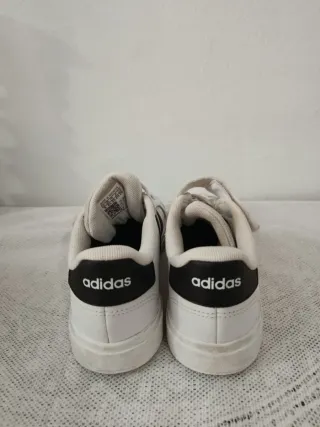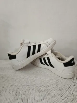Zapatillas deportivas Adidas en color blanco. Perfectas para el día a día. Usadas con frecuencia pero en buen estado - Cierre con cordones. - Detalle de tres rayas laterales.