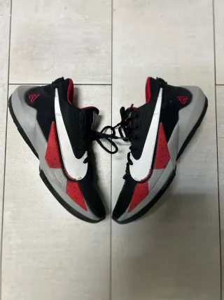El precio es muy bueno en comparación con el precio de venta actual (imagen insertada). Zapatillas de baloncesto Nike con un diseño moderno y llamativo. - Combinación de colores negro, rojo y gris. - Swoosh blanco característico de la marca. - Detalles en rojo y gris en la suela y laterales.