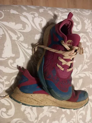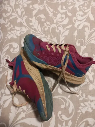 Zapatillas deportivas para montaña con un diseño llamativo. Marca +8000 usadas en 4 ocasiones, se venden por hacer rozadura. - Combinación de colores rosa y azul. - Suela con buen agarre para terrenos irregulares. - Cordones resistentes para un ajuste seguro.