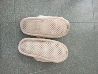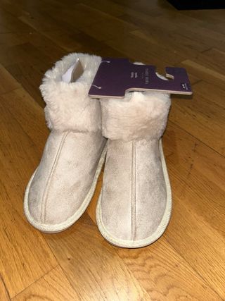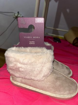 Zapatillas de estar por casa de la marca Isabel Mora, en color beige y talla 38. Han sido usadas muy poco y son muy cómodas. - Diseño tipo botín. - Forro interior de pelo sintético. - Suela antideslizante.