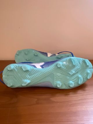 Zapatillas de fútbol Puma para hombre, talla 42. Diseñadas para un rendimiento óptimo en el campo. - Color azul con detalles en verde. - Logo Puma blanco en los laterales. - Cierre de cordones. - Suela con tacos para césped.