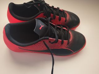 Vendo zapatillas de fútbol Puma para niño. Están en muy buen estado, apenas usadas. - Ideales para entrenar o jugar partidos. - Diseño moderno y atractivo en rojo y negro. - Talla (especificar talla).