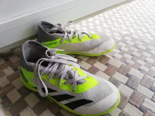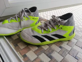 Zapatillas de fútbol sala Adidas Predator. Número 32 - Diseño moderno en gris con detalles en verde neón. - Talla para jóvenes deportistas. - Suela de goma para un buen agarre.