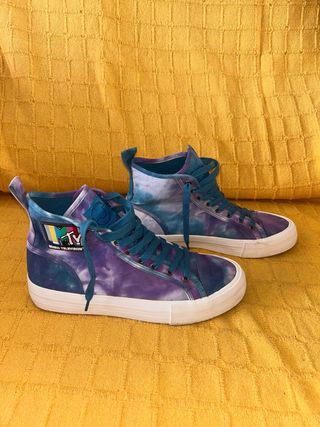 Zapatillas de caña alta, estilo converse, edición especial MTV con un diseño tie-dye único en tonos azules y morados, con el logo de MTV. - Estampado tie-dye. - Detalle del logo de MTV Music Television. - Muy poco uso, practicamente como nuevas. #converse