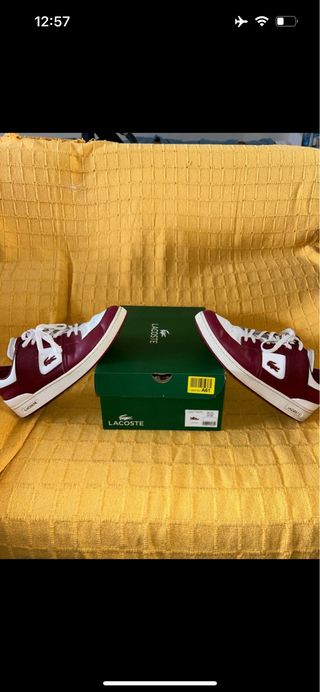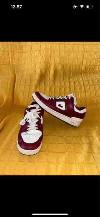 Zapatillas de la marca Lacoste en color rojo y blanco. - Diseño deportivo y moderno. - Detalle del logo de Lacoste en el lateral. - Cordones blancos. - Suela de goma. - Solo reseñable que se le ha caido alguna letra de atras, como se pueder ver en la foto.