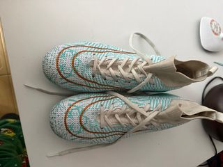 Zapatillas de fútbol con un diseño llamativo. - Patrón geométrico en tonos turquesa y blanco. - Cordones de color beige. - Cuello elástico para un ajuste cómodo.