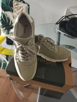 Zapatillas de la marca Natuform en tonos verde oliva clarito y blanco. Un calzado cómodo y versátil. -su precio son de 44,99 rebajado 39,99 puestas una ocasión . -cremallera lateral para poner más cómodamente. - Diseño con perforaciones. - Cierre de cordones. - Detalle de logo en la plantilla.
