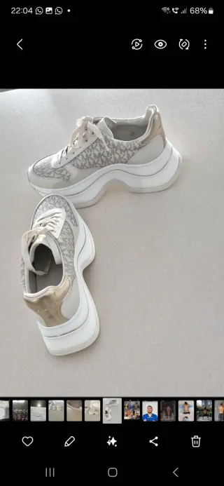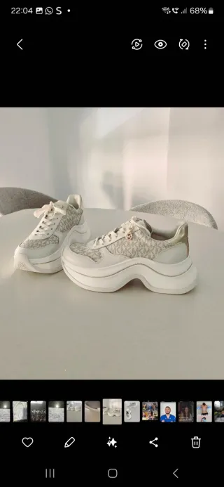 Zapatillas de la marca Michael Kors con un diseño moderno y elegante. - Combinación de blanco y detalles dorados. - Estampado MK característico en la tela. - Suela gruesa y cómoda.