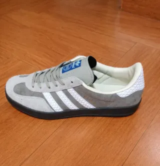 Zapatillas Adidas Samba en tonos grises y blancos. Un clásico atemporal con un diseño icónico. - Parte superior de ante y detalles sintéticos. - Tres rayas características de Adidas en blanco. - Suela de goma. - Etiqueta con logo de Adidas en la lengüeta. - Incluye etiqueta de tecnología Ortholite.