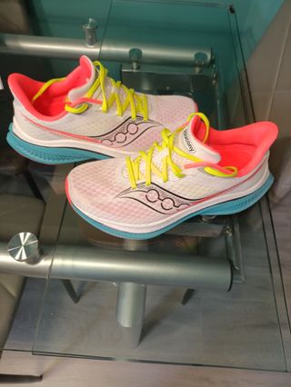 Zapatillas deportivas Saucony Endorphin Speed 5. Talla 42. Usadas únicamente 30km. Sin caja. - Diseño moderno en blanco y rosa. - Cordones de color amarillo brillante. - Suela con detalles en azul turquesa.