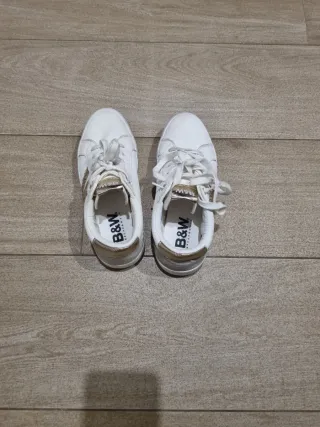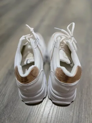 Zapatillas blancas con detalles dorados y suela de plataforma. - Diseño moderno y llamativo. - Combinación de blanco y dorado. - Plataforma para mayor altura.