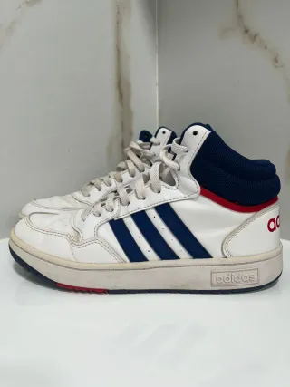 Zapatillas deportivas de caña media de la marca Adidas. - Diseño clásico con las tres franjas. - Combinación de blanco, azul marino y detalles en rojo. - Cierre con cordones.
