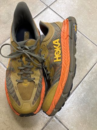Zapatillas Hoka Mafate Speed 4 en talla 44 2/3. Diseñadas para corredores, combinan colores verde oliva y naranja. - Parte superior de malla transpirable. - Suela Vibram para un agarre óptimo. - Mediasuela con amortiguación característica de Hoka.