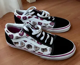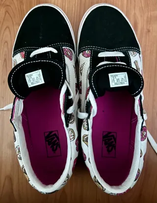 Zapatillas Vans Old Skool con un divertido estampado de donuts. El diseño combina el negro clásico con detalles en rosa. - Estampado de donuts en toda la zapatilla. - Paneles laterales en negro. - Cordones blancos. - Suela blanca con borde rosa.