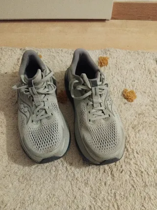 Zapatillas deportivas Hoka en tonos grises. Perfectas para el día a día o para tus entrenamientos. - Diseño moderno y llamativo. - Suela gruesa para mayor comodidad.
