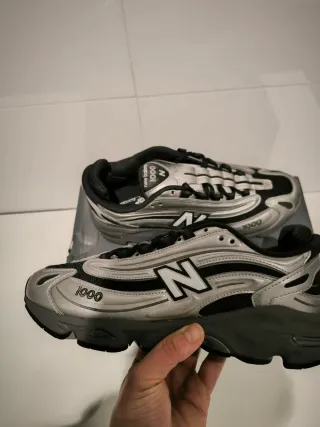 Zapatillas deportivas New Balance modelo 1000. - Diseño moderno en color plata y negro. - Detalle del número 1000 en el lateral. - Logotipo 'N' característico de la marca.
