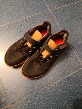 Zapatillas de fútbol sala para niño. -Talla 34 - Cierre de velcro y cordones. - Detalle de perforaciones en la parte superior. - Suela de goma naranja.