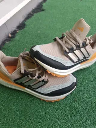 Par de zapatillas deportivas para cross country. - Diseño bicolor llamativo. - Cordones a juego con cada zapatilla. Usadas una única vez; en perfecto estado.